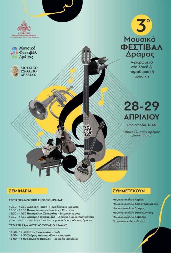 Ξεκινά το 3ο Μουσικό Φεστιβάλ Δράμας, στις 28 και 29 Απριλίου 2026 από το Μουσικό Σχολείο Δράμας υπό την αιγίδια της Περιφέρειας Ανατολικής Μακεδονίας & Θράκης.