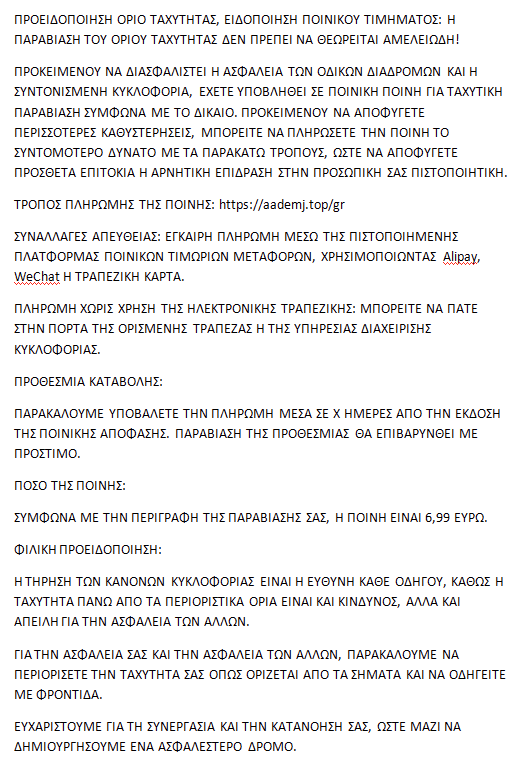 δήθεν επιβολής «ποινής» ή «προστίμου» για υπέρβαση ορίου ταχύτητας.