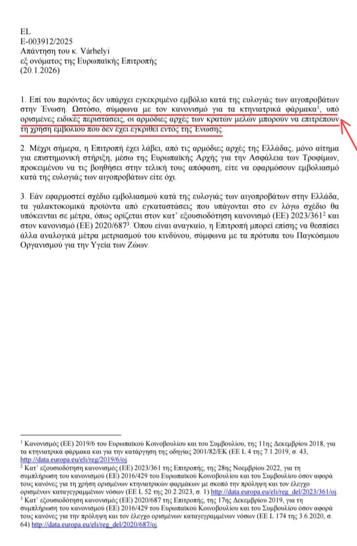 Η επιλεκτική ανάγνωση της επιστολής του Επιτρόπου κ. Várhelyi και η παραπλανητική επίκληση ευρωπαϊκών κανονισμών δημιουργούν λανθασμένες εντυπώσεις και υπονομεύουν την ενημέρωση των κτηνοτρόφων και της κοινωνίας.