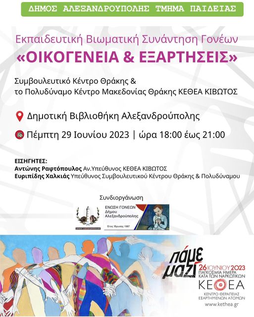 Με αφορμή την Παγκόσμια Ημέρα κατά των Ναρκωτικών 2023 ο ο Δήμος Αλεξανδρούπολης με το Τμήμα Παιδείας της Διεύθυνσης Κοινωνικής Προστασίας, Παιδείας & Αθλητισμού και το Πολυδύναμο Κέντρο Ανατολικής Μακεδονίας-Θράκης ΚΕΘΕΑ Κιβωτός σε συνεργασία με την Ένωση Συλλόγων Γονέων των Σχολείων του Δήμου, διοργανώνουν μια τρίωρη εκπαιδευτική βιωματική συνάντηση με θέμα: «ΟΙΚΟΓΕΝΕΙΑ & ΕΞΑΡΤΗΣΕΙΣ» που θα πραγματοποιηθεί στη Δημοτική Βιβλιοθήκη Αλεξανδρούπολης την Πέμπτη 29 Ιουνίου 2023, ώρες 18:00 – 21:00.