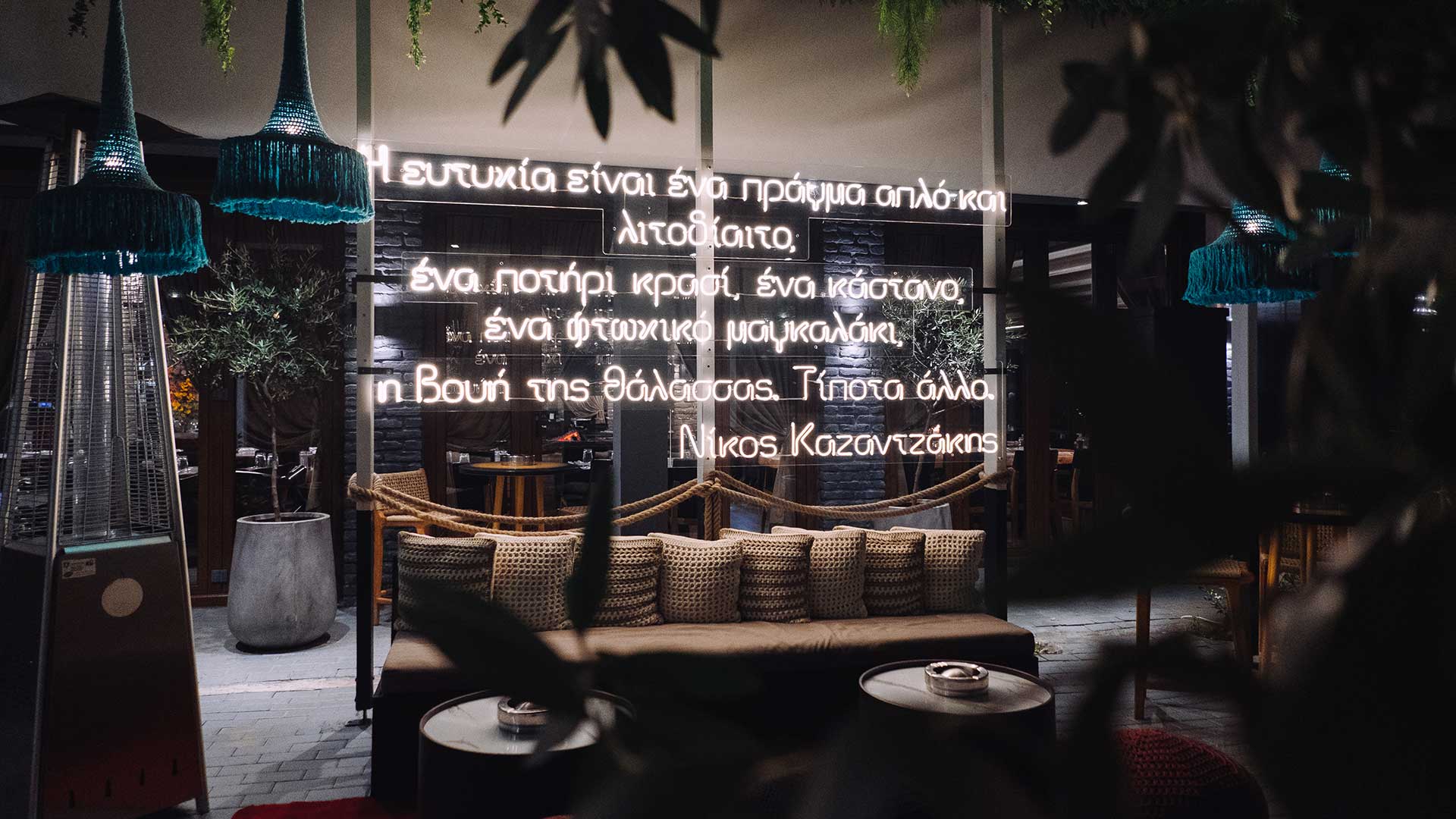 Το μενού, που έχει αναλάβει τα τελευταία τρία χρόνια ο Μυτιληνιός σεφ Βασιλείου, ένας μάγειρας εξοικειωμένος με το καλό, φρέσκο ψάρι από τα παιδικά του χρόνια, ήταν χειμωνιάτικο, απολαυστικά θερμαντικό: ξεκινήσαμε με καταπραϋντική ζεστή ψαρόσουπα κρέμα, ορεκτικό χούμους με γαρίδες, κουκουνάρι, λάδι καραβίδας και λεμόνι τουρσί, ένα δροσερό και σπιρτόζικο ταρτάρ ψαριού με λάιμ, σερβιρισμένο με το υπόλοιπο του ψαριού σαν γλυπτό, κριθαράκι μαγειρεμένο σαν ριζότο (κριθαρότο) με γαρίδες, και καλαμαράδα με πέστο βασιλικού, μαραθόριζα και φέτα. Το κύριο πιάτο ήταν ζουμερό φιλέτο ψαριού με πουρέ σελινόριζας, ψητό μπρόκολο και σάλτσα από αριάνι με άνηθο. Κλείσαμε με χασλαμά Σαμοθράκης, ένα χειμωνιάτικο γλύκισμα με βάση που θυμίζει μελομακάρονο, σερβιρισμένο με σεμιφρέντο φυστίκι Αιγίνης.