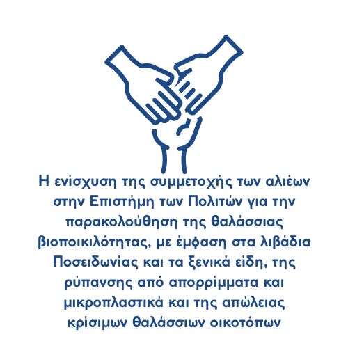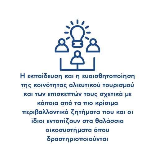 Το πρόγραμμα «Αλιευτικός Τουρισμός & Κλιματική Αλλαγή: Προς Βιώσιμες και Καινοτόμες Πρακτικές» που πραγματοποιείται σε συνεργασία με το Πανελλήνιο Σωματείο Αλιευτικού Τουρισμού Επαγγελματιών Αλιέων και τη Σχολή Μεταλλειολόγων Μεταλλουργών Μηχανικών – Εθνικό Μετσόβιο Πολυτεχνείο, αποσκοπεί στην ενδυνάμωση επαγγελματιών αλιέων που δραστηριοποιούνται στον αλιευτικό τουρισμό προκειμένου να υιοθετήσουν υπεύθυνες πρακτικές και να ενισχύσουν την ανθεκτικότητά τους απέναντι στις επιπτώσεις της κλιματικής κρίσης. Ένας ακόμη βασικός άξονας του προγράμματος αποτελεί η ευαισθητοποίηση των αλιέων και των επισκεπτών τους με στόχο τη συμμετοχή τους στη συλλογή δεδομένων μέσα από την Επιστήμη των Πολιτών.