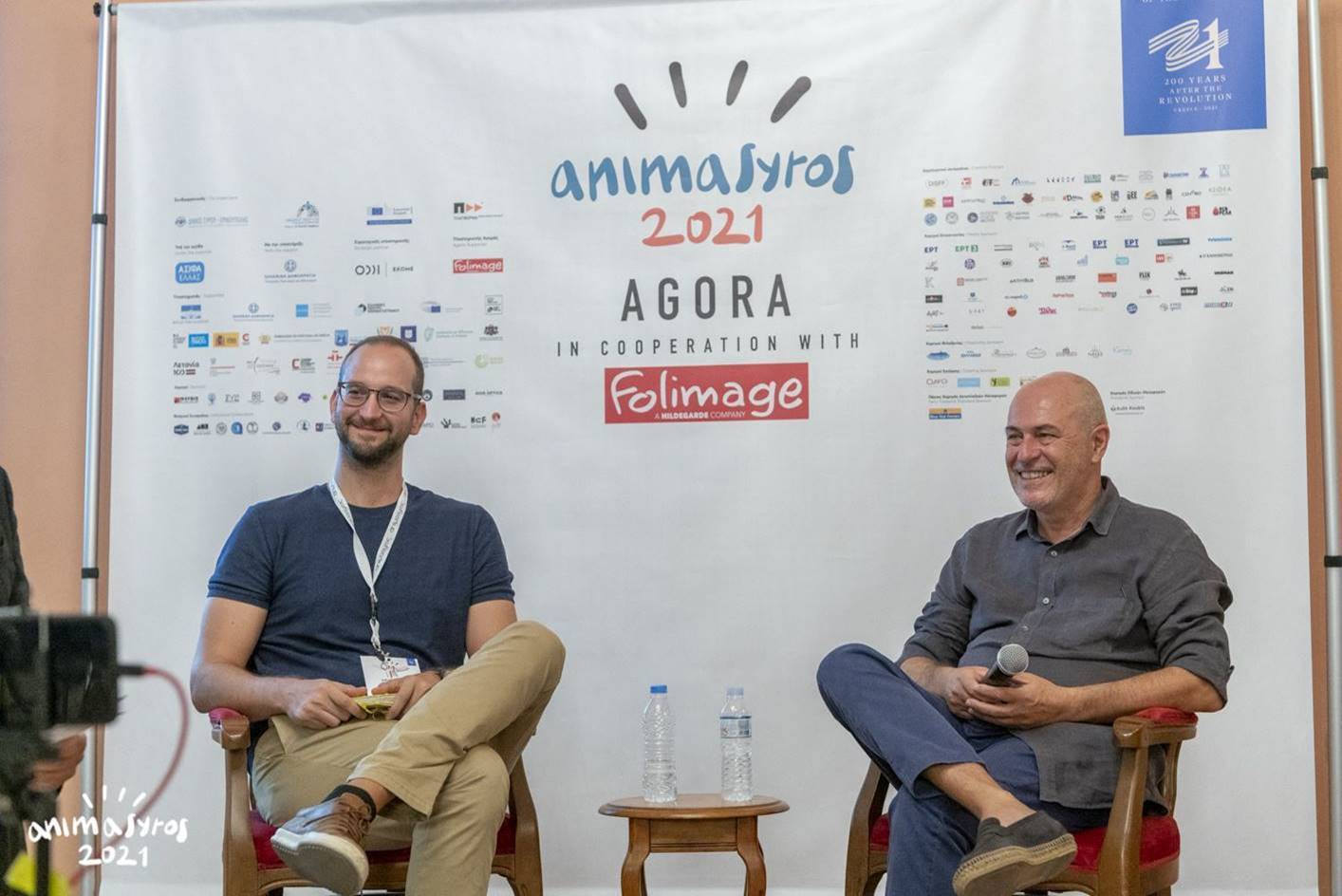 Ο Κώστας Τσουτσοπλίδης, Επικεφαλής του Γραφείου του Ευρωπαϊκού Κοινοβουλίου στην Ελλάδα και ο σκηνοθέτης και μέλος του Διοικητικού Συμβουλίου της Ένωσης Κινουμένων Σχεδίων ΑΣΙΦΑ ΕΛΛΑΣ, Φωκίωνας Ξένος στο Animasyros 2021