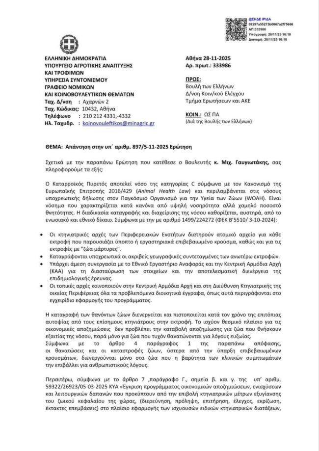«Αποσιώπηση επιλέξιμων αποζημιώσεων για τον Καταρροϊκό Πυρετό – Αποκαλυπτικά έγγραφα του ΥΠΑΑΤ»|