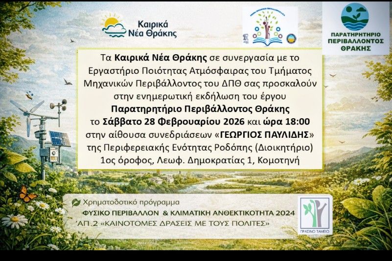 “Καιρικά Νέα Θράκης”: Ενημερωτική εκδήλωση της δημοφιλούς Θρακιώτικης ιστοσελίδας για την παρουσίαση του έγου “Παρατηρητήριο Περιβάλλοντος Θράκης”