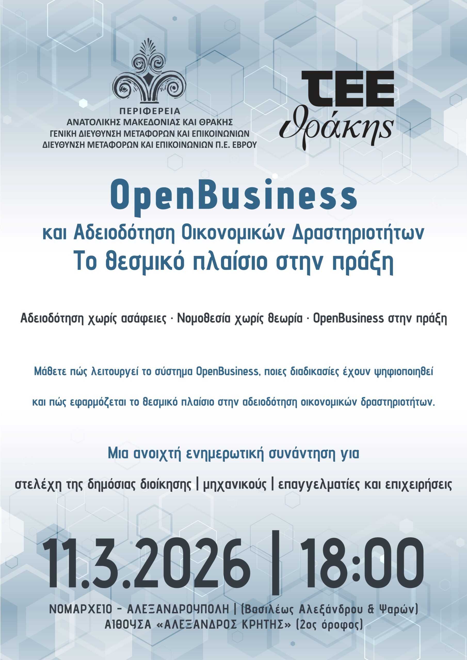 ΤΕΕ Θράκης & ΠΑΜΘ: Διοργάνωση Ημερίδας με θέμα “OpenBusiness και Αδειοδότηση Οικονομικών Δραστηριοτήτων: Το θεσμικό πλαίσιο στην πράξη”