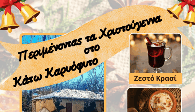 Ο Πολιτιστικός Σύλλογος Καρυοφύτου διοργανώνει μια μοναδική χριστουγεννιάτικη γιορτή στο γραφικό Κάτω Καρυόφυτο Ξάνθης, προσκαλώντας μικρούς και μεγάλους να ζήσουν μια ξεχωριστή ημέρα γεμάτη παράδοση, δημιουργία και φυσική ομορφιά.
