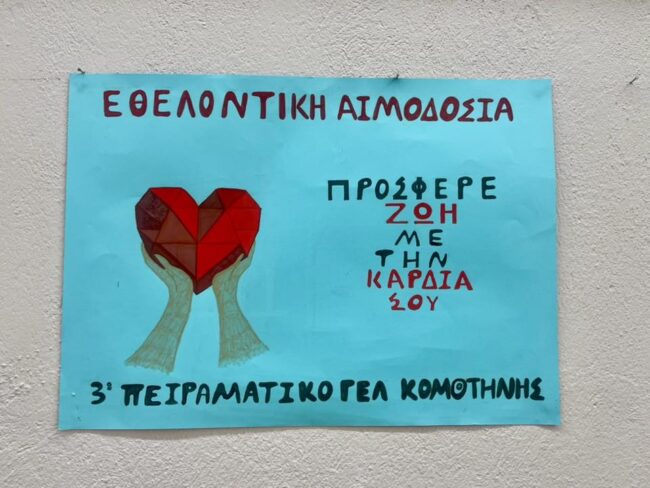 Με βαθιά συγκίνηση και ειλικρινή υπερηφάνεια συγχαίρουμε το 3ο Πειραματικό Γενικό Λύκειο Κομοτηνής για τη σπουδαία διάκρισή του στον Πανελλήνιο Διαγωνισμό Αιμοδοσίας, όπου κατέκτησε την 3η θέση. Η επιτυχία αυτή δεν αποτελεί απλώς μια τιμητική αναγνώριση, είναι μια πράξη που αντανακλά αξίες, ήθος και μια βαθιά ριζωμένη κουλτούρα προσφοράς.