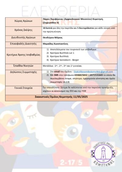 Διήμερο Σκακιστικό Φεστιβάλ στο πλαίσιο των Ελευθερίων Θράκης 2025 στην Κομοτηνή 10 & 11 Μαΐου – Πάρκο Περιφέρειας