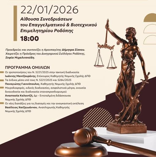 Δικηγορικός Σύλλογος Ροδόπης: Ημερίδα με θέμα “Οι τροποποιήσεις στον Κώδικα Πολιτικής Δικονομίας μετά το Ν5221/2025”