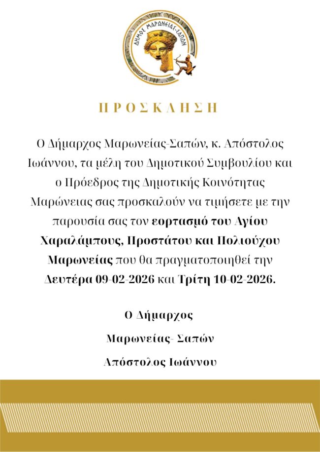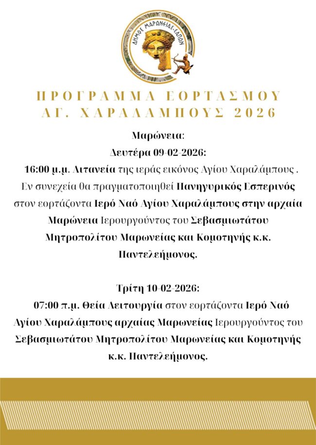 Δήμος Μαρώνειας-Σαπών: Πρόσκληση για τον Εορτασμό του Αγίου Χαραλάμπους στη Μαρώνεια