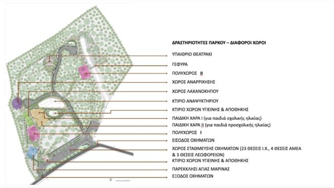 Η αρχιτεκτονική και τεχνική μελέτη του έργου προβλέπει μια ολιστική αναμόρφωση της περιοχής, η οποία εκκινεί από την καθαίρεση των παλαιών, ερειπωμένων υποδομών και την εκτεταμένη εξυγίανση του ανάγλυφου. Στη θέση τους, αναπτύσσεται ένα νέο, οργανωμένο δίκτυο κυκλοφορίας με βασικά και δευτερεύοντα μονοπάτια από φιλικά προς το περιβάλλον υλικά, τα οποία έχουν σχεδιαστεί με αυστηρές προδιαγραφές και ήπιες κλίσεις, ώστε να εγγυώνται την ανεμπόδιστη και ασφαλή πρόσβαση για τα Άτομα με Αναπηρία σε κάθε σημείο δραστηριότητας. Παράλληλα, προβλέπεται η ανακατασκευή της γραφικής πεζογέφυρας η οποία θα εξασφαλίζει την αρμονική σύνδεση των επιμέρους ζωνών του πάρκου. Στην καρδιά του άλσους θα ανεγερθεί ένα υπερσύγχρονο, βιοκλιματικό αναψυκτήριο το οποίο θα πλαισιώνεται από ξύλινες πέργκολες-πολυχώρους, ιδανικές για τη φιλοξενία υπαίθριων πολιτιστικών εκθέσεων και εκδηλώσεων. Ιδιαίτερη μέριμνα λαμβάνεται για τη νέα γενιά, με την κατασκευή δύο ξεχωριστών, ασφαλών παιδικών χαρών για νήπια και παιδιά σχολικής ηλικίας, στίβου αναρρίχησης καθώς και ενός υπαίθριου θεάτρου. Το στοιχείο της βιωματικής επαφής με τη φύση ενισχύεται μέσω ενός εκπαιδευτικού λαχανόκηπου φυτεμένου με τοπικά βότανα και μυρωδικά που θα φέρουν ειδικές ενημερωτικές πινακίδες. Όλες αυτές οι λειτουργίες θωρακίζονται με την κατασκευή νέας, ασφαλούς περίφραξης, την εγκατάσταση ολοκληρωμένων δικτύων ύδρευσης, αποχέτευσης και πυρόσβεσης, καθώς και την τοποθέτηση σύγχρονου συστήματος “έξυπνου” φωτισμού με ιστούς και χαμηλά φωτιστικά κολωνάκια που θα προσδίδουν αίσθηση ασφάλειας τις νυχτερινές ώρες. Τέλος, η δημιουργία ενός άρτια οργανωμένου χώρου στάθμευσης είκοσι τριών θέσεων, με πρόβλεψη για οχήματα ΑμεΑ και τουριστικά λεωφορεία, θα διασφαλίσει την ομαλή πρόσβαση από το οδικό δίκτυο.