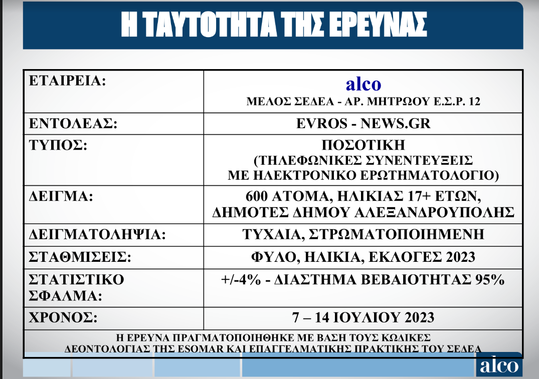 Η έτευνα τρεις μήνες πριν την πρώτη Κυριακή των Δημοτικών εκλογών, έγινε σε δείγμα 600 ατόμων, δημότες Αλεξανδρούπολης ηλικίας άνω των 17 ετών, το χρονικό διάστημα 7 έως 14 Ιουλίου. Πραγματοποιήθηκε με τηλεφωνικές συνεντεύξεις και ηλεκτρονικό ερωτηματολόγιο και το δείγμα ήταν τυχαίο, στρωματοποιημένο ανά φύλλο και ηλικία. Η εταιρεία ALCO του Κώστα Παναγόπολου είναι άλλωστε από τις καταξιωμένες και παλαιότερες στην Ελλάδα, πραγματοποιεί δεκάδες δημοσκοπήσεις σε κάθε είδους εκλογές και αποτελεί από τα πρώτα μέλη του ΣΕΔΕΑ (Σύλλογος Εταρειών Δημοσκόπησης και Έρευνας Αγοράς).