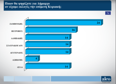 - Στην έρευνα της ALCO περιλαμβάνεται και ο υποψήφιος δήμαρχος Στάθης Ασπιώτης, ο οποίος όμως χθες ανακοινώθηε ότι συνενώθηκε με την παράταξη “Πόλη και Πολίτες” του τέως δημάρχου Βαγγέλη Λαμπάκη.