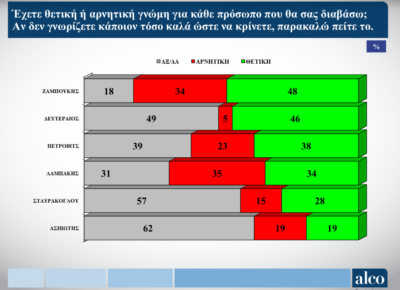 Ένα επίσης πολύ σημαντικό στοιχείο της δημοσκόπησης, είναι τα αποτελέσματα της ερώτησης: “Έχετε θετική ή αρνητική γνώμη για κάθε πρόσωπο που θα σας διαβάσω; Αν δεν γνωρίζετε κάποιον τόσο καλά ώστε να κρίνετε, παρακαλώ πείτε το”. Ο σημερινός δήμαρχος Γιάννης Ζαμπούκης, αν και είναι αυτός που ασκεί εξουσία τα τελευταία 4 χρόνια, έχει υψηλό ποσοστό θετικής γνώμης, αφού ένας στους δύο πολίτες που ρωτήθηκαν και συγκεκριμένα ποσοστό 48%, απαντάει πως έχει θετική γνώμη γι’ αυτόν. Ακολουθεί ο Σάββας Δευτεραίος με 46%, αλλά αυτόν δηλώνουν ότι δεν τον γνωρίζουν οι μισοί από τους ερωτηθέντες, ποσοστό 49% όπως μπορείτε να δείτε.