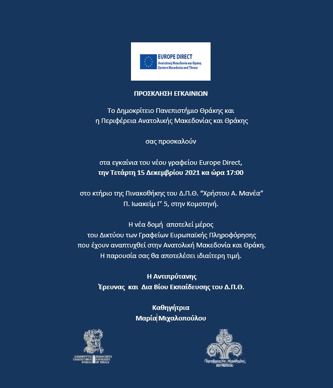 Το Δημοκρίτειο Πανεπιστήμιο Θράκης και η Περιφέρεια Ανατολικής Μακεδονίας – Θράκης θα πραγματοποιήσουν τα εγκαίνια του νέου γραφείου EuropeDirect, την Τετάρτη 15 Δεκεμβρίου 2021 και ώρα 17:00, το οποίο  θα στεγαστεί  στο κτήριο της Πινακοθήκης του Ιδρύματος  “Χρήστου Α. Μανέα” Π. Ιωακείμ Γ’ 5, στην Κομοτηνή.