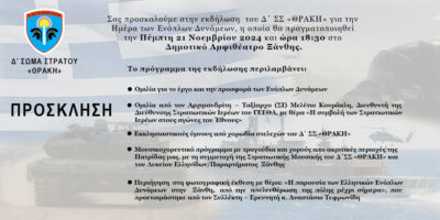 Το Δ΄ΣΣ «ΘΡΑΚΗ», με αφορμή την Ημέρα των Ενόπλων Δυνάμεων, θα διοργανώσει εορταστική εκδήλωση στο Αμφιθέατρο του Κέντρου Πολιτισμού Δήμου Ξάνθης «ΚΩΝ/ΝΟΣ ΜΠΕΝΗΣ», την Πέμπτη 21 Νοε 24 και ώρα 18:30.