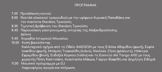 Τη βραδιά θα πλαισιώσει η χορωδία του Ιστορικού Μουσείου Αλεξανδρούπολης, καλλιτεχνικό σχήμα από το Ωδείο ΦΑΕΘΩΝ και το Esencia del Tango AXD.