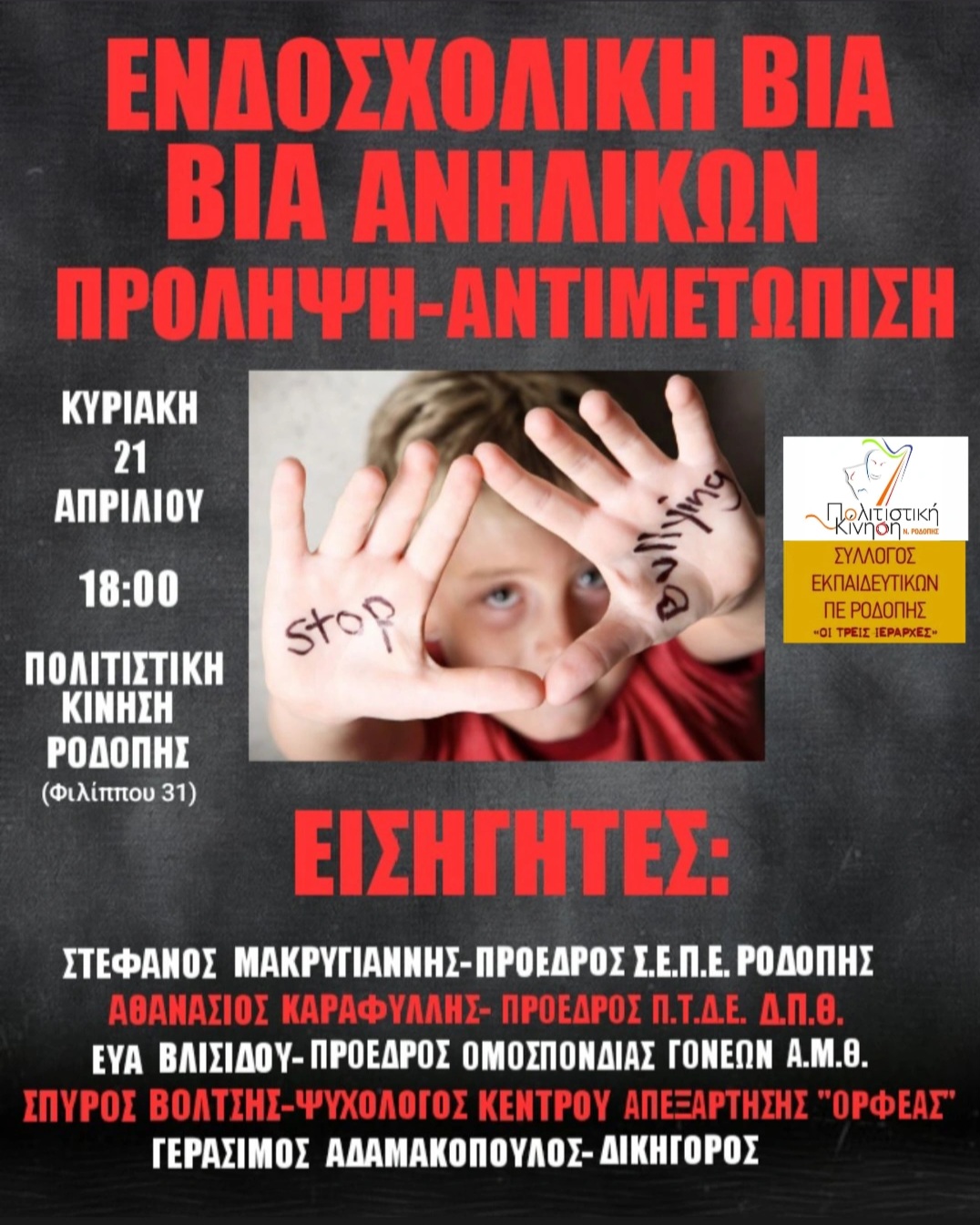 Η Πολιτιστική Κίνηση Ν. Ροδόπης, αφουγκραζόμενη τις ανησυχίες, τους φόβους και τους προβληματισμούς των γονέων, των δασκάλων και των μαθητών, σε συνεργασία με το Σύλλογο Εκπαιδευτικών ΠΕ Ροδόπης “Οι Τρείς Ιεράρχες”, διοργανώνει εκδήλωση με θέμα: “Ενδοσχολική βία, Βία ανηλίκων, Πρόληψη-Αντιμετώπιση”. Την εκδήλωση θα πλαισιώσουν οι κάτωθι αξιόλογοι εισηγητές οι οποίοι θα αναλύσουν αυτό το τόσο σοβαρό θέμα, μιλώντας ο καθένας πάνω στο αντικείμενό του.