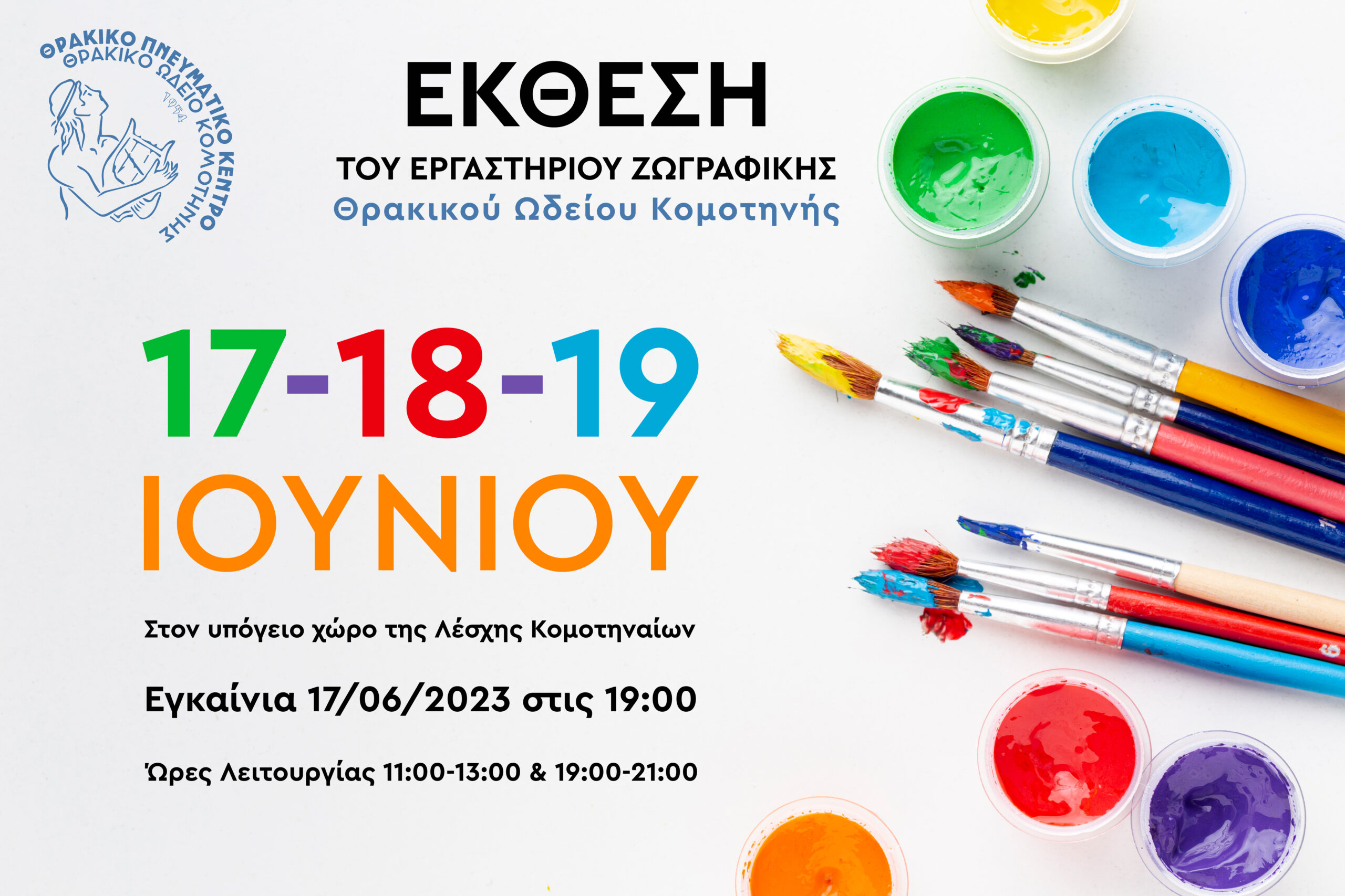 Το Θρακικό Πνευματικό Κέντρο Κομοτηνής με υπερηφάνεια ανακοινώνει την επερχόμενη έκθεση ζωγραφικής των ταλαντούχων μαθητών του. Η έκθεση, που θα πραγματοποιηθεί στις 17, 18 και 19 Ιουνίου, θα φιλοξενηθεί στον υπόγειο χώρο της Λέσχης Κομοτηναίων.