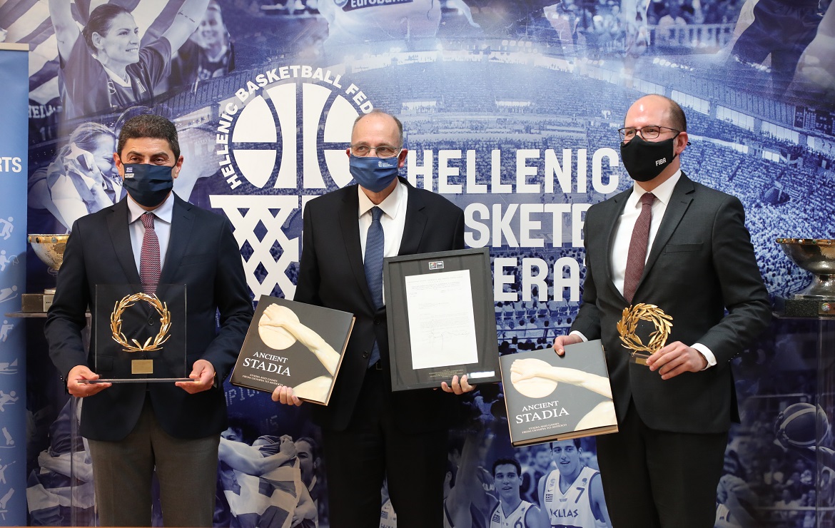Μετά το τέλος της συνομιλίας των τριών, το λόγο πήρε πρώτος ο οικοδεσπότης πρόεδρος της ΕΟΚ: «Κύριε υπουργέ, κύριε γενικέ γραμματέα της FIBA σας εύχομαι χρόνια πολλά και σας ευχαριστώ που επισκεφτήκατε τα γραφεία της Ελληνικής Ομοσπονδίας Καλαθοσφαίρισης το σπίτι του μπάσκετ στην Ελλάδα. Χαίρομαι ιδιαιτέρως που συνυπάρχουμε στον ίδιο χώρο αυτές τις άγιες ημέρες με το ένα σπίτι μας το ελληνικό, που είναι το υπουργείο Αθλητισμού και με δεύτερο σπίτι μας το παγκόσμιο σπίτι μας που είναι η FIBA. Σήμερα είχαμε την ευκαιρία να βρεθούμε και να συζητήσουμε θέματα που έχουν να κάνουν με το παρόν και το μέλλον του ελληνικού μπάσκετ. Είμαι πολύ χαρούμενος που είδα να υπάρχει τέτοια αγαστή συνεργασία μεταξύ των τριών θεσμών και η διάθεση από όλους μας για να πάει το μπάσκετ σε πολύ γρήγορους σταθερούς ρυθμούς εκεί που του αξίζει το οποίο δεν είναι μόνο οι καλύτερες ημέρες στην Ελλάδα αλλά η κορυφή της Ευρώπης. Και όχι μόνο της Ευρώπης αλλά και του κόσμου. Σήμερα είχαμε την ευκαιρία να συζητήσουμε και να εκφράσω τις απόψεις μου και στον υπουργό και τον γενικό γραμματέα και είμαι χαρούμενος που έχω να κάνω κάποιες ανακοινώσεις. Συζητήσαμε πολλά θέματα που μας απασχολούν πολύ. Το ένα έχει να κάνει με τις διοργανώσεις που αιτηθήκαμε στη FIBA για να πάρει η Ελλάδα και έγιναν αποδεκτές. Πέρα από το ευρωπαϊκό πρωτάθλημα νεανίδων που ήδη έχουμε αναλάβει για το 2022. Υπάρχει το U17 3X3 το οποίο θα γίνει στην Αθήνα το 2022 και η δεύτερη είναι το Ευρωπαϊκό U20 των Νέων Ανδρών το 2023 που θα πραγματοποιηθεί στην Κρήτη. Επειδή το 2022 γιορτάζουμε τα 90 χρόνια της FIBA, η Ελλάδα, ως μία από οκτώ τα ιδρυτικά μέλη, την ιδρυτική μέρα 18 Ιουνίου 2022 θα υπάρξει μια μεγάλη εκδήλωση στο Καλλιμάρμαρο και θα υπάρξουν και άλλες εκδηλώσεις σε άλλα μέρη της Ελλάδας.