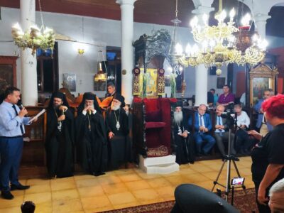 Αμέσως μετά την υποδοχή της Ιερής Εικόνας στην πλατεία της Μαρώνειας, τελέστηκε δοξολογία στον Ιερό Ναό Κοιμήσεως της Θεοτόκου, όπου ο κ. Θεόδωρος Περβανάς αναφέρθηκε στο ιστορικό της μεταφοράς της Εικόνας από τους Μαρωνίτες πρόσφυγες στον Πειραιά.