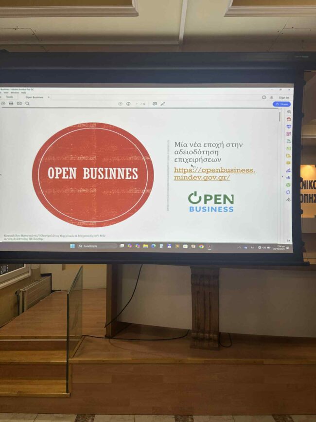Η εκδήλωση αυτή είχε σαν στόχο την ενημέρωση των επαγγελματιών στην νέα πραγματικότητα αδειοδότησης και ψηφιοποίησης μέσα από την εφαρμογή του Οpen businnes.