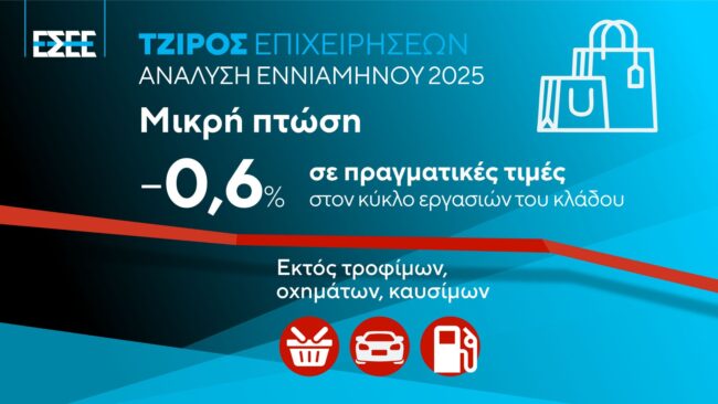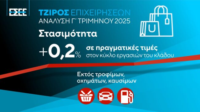 Ο ρυθμός ενίσχυσης του τζίρου κατά το Γ΄ τρίμηνο του 2025 ανήλθε σε 2,8% συγκριτικά με το ίδιο τρίμηνο του 2024, σχεδόν όσο και ο ρυθμός πληθωρισμού για το αντίστοιχο χρονικό διάστημα. Αυτό σημαίνει πως η αύξηση του πραγματικού όγκου πωλήσεων ήταν μηδαμινή (0,2%) όπως διαπιστώνει η ΕΣΕΕ.