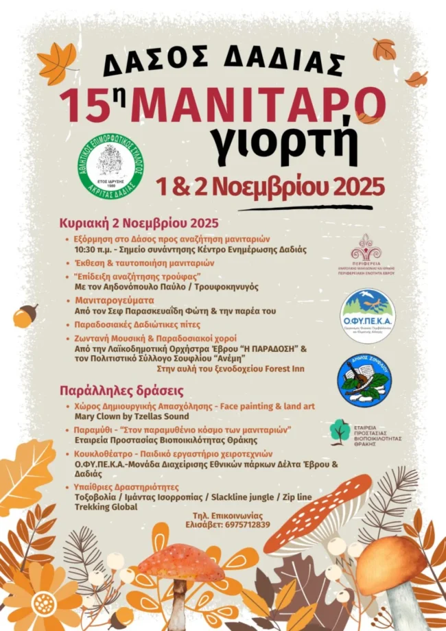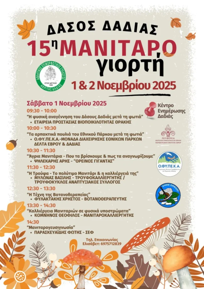 Έφτασε η στιγμή για το καθιερωμένο ραντεβού στο μαγευτικό Δάσος Δαδιάς, το Σαββατοκύριακο 1 και 2 Νοεμβρίου 2025, για να βουτήξουμε στον παραμυθένιο κόσμο των μανιταριών!