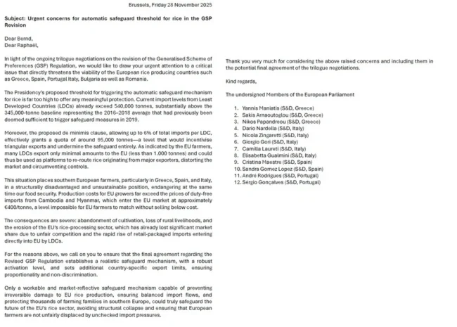 Στην επιστολή τους, οι Σοσιαλιστές Ευρωβουλευτές υπογράμμιζαν ότι οι ευρωπαίοι παραγωγοί βρίσκονται «στο χείλος του γκρεμού». Η συνεχώς αυξανόμενη εισροή αφορολόγητου ρυζιού από τρίτες χώρες έχει ήδη οδηγήσει καλλιεργητές σε εγκατάλειψη της παραγωγής, απειλώντας έναν ολόκληρο αγροτικό κλάδο ζωτικής σημασίας για την επισιτιστική ασφάλεια της Ευρώπης.
