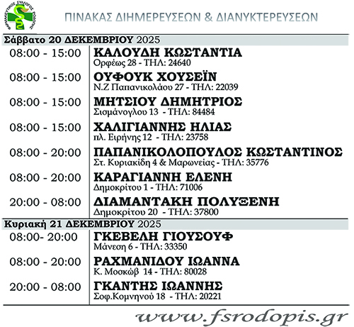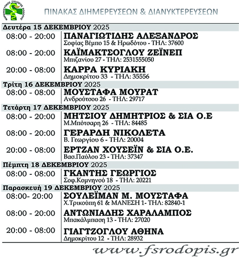 ΑΡΧΙΚΗΚΟΙΝΩΝΙΑΕΙΔΗΣΕΙΣΦαρμακεία (19-21 Δεκ.) ΘΡΑΚΙΚΗ ΑΓΟΡΑ15 Δεκεμβρίου, 2025 9:46 πμ ΚΑΤΗΓΟΡΙΑ ΕΙΔΗΣΕΙΣΚΟΙΝΩΝΙΑΤΟΠΙΚΗ ΑΥΤΟΔΙΟΙΚΗΣΗΥΓΕΙΑΦΑΡΜΑΚΕΙΑ Μοιραστείτε τό