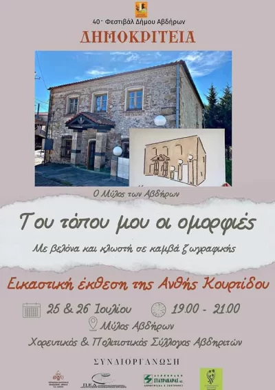 Η έκθεση είναι ανοιαχτή για το κοινό Τρίτη 25 και Τετάρτη 26 Ιουλίου και ώρες 19.00 έως 21.00 στον παραδοσιακό Μύλο των Αβδήρων Ξάνθης .