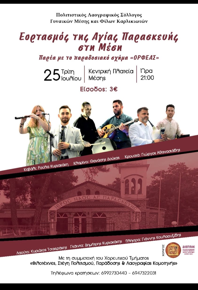 Μ’ αυτό το μήνυμα ο Πολιτιστικός Λαογραφικός Σύλλογος Γυναικών Μέσης και Φίλων Καρλικιωτών προαναγγέλει το γλέντι που θα πραγματοποιηθεί στον ομώνυμο οικισμό του Δήμου Κομοτηνής, για τον εορτασμό της Αγίας Παρασκευής, προστάτιδας του χωριού.