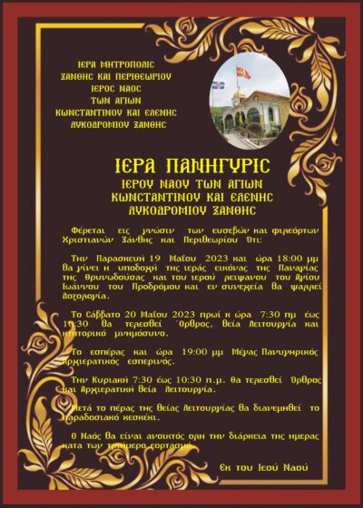 «Το εκκλησιαστικό συμβούλιο του Ιερού Ναού Αγίων Κωνστνατίνου και Ελένης Λυκοδρομίου Ξάνθης βρίσκεται στην ευχάριστη θέση να ανακοινώσει την άφιξη της θαυματουργού ιεράς εικόνας της Παναγίας της Θρηνωδούσας και τον λειψάνων του Αγίου Ιωάννη του Προδρόμου την Παρασκευή 19 Μαΐου 2023 και ώρα 18:00 το απόγευμα» τονίζεται σε σχετική ενημέρωση από τον Ιερό Ναό.