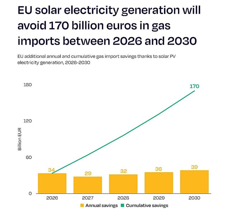 Ωστόσο, νέα ανάλυση της SolarPower Europe δείχνει ότι η αξιοποίηση της ηλιακής ενέργειας έχει εξοικονομήσει για την Ευρώπη πάνω από 100 εκατ. ευρώ την ημέρα από την 1η Μαρτίου, με τις συνολικές εξοικονομήσεις να ξεπερνούν τα 3 δισ. ευρώ. Αν οι τιμές του φυσικού αερίου παραμείνουν υψηλές, οι ειδικοί εκτιμούν ότι οι συνολικές εξοικονομήσεις το 2026 θα μπορούσαν να φτάσουν τα 67,5 δισ. ευρώ.
