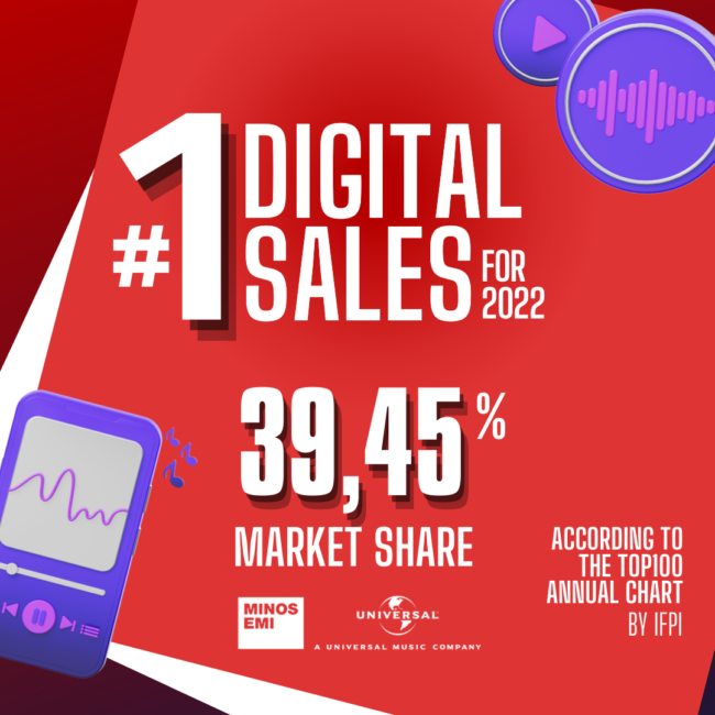 Από πλευράς market share, η Minos EMI / Universal κατέκτησε την 1η θέση με το 59,74% του Annual Top100 Physical Sales Chart 2022.