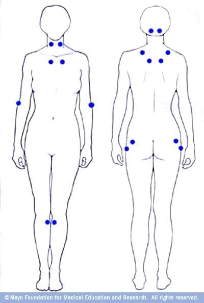 Για να τεθεί η διάγνωση χρειάζεται να υπάρχει διάχυτος πόνος στο σώμα για τουλάχιστον τρεις μήνες και να είναι επώδυνα τα 11 από τα 18 σημεία της εικόνας. Ωστόσο, τελευταία αμφισβητούνται και αυτά τα σημεία.