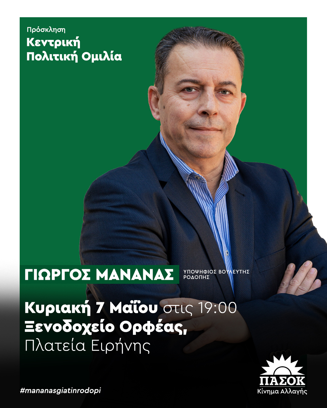 Την Κυριακή 7 Μαΐου 2023 στις 19:00θα πραγματοποιηθεί η Κεντρική Πολιτική ομιλία του Υποψηφίου Βουλευτή του ΠΑΣΟΚ – Κίνημα Αλλαγής Γιώργου Μανανά στην Κομοτηνή στο Ξενοδοχείο Ορφέας (Πλατεία Ειρήνης)
