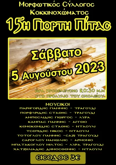 Ο Μορφωτικός Σύλλογος Κοκκινοχώματος διοργανώνει  την 15η Γιορτή Πίτας, το Σάββατο 5 Αυγούστου 2023 και ώρα 20:30 μ.μ στον προαύλιο χώρο του Δημοτικού Σχολείου Κοκκινοχώματος, προσφέροντας στους επισκέπτες  ένα μεγάλο λαϊκο-ποντιακό γλεντι, στο οποίο θα έχουν την ευκαιρία να γευτούν περίπου 15.000 κομμάτια πίτας και δροσιστικό αριάνι, ενώ την εκδήλωση πλαισιώνουν καταξιωμένοι καλλιτέχνες του είδους, με ζωντανή μουσική και τραγούδι