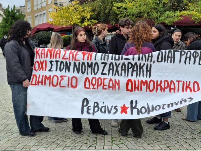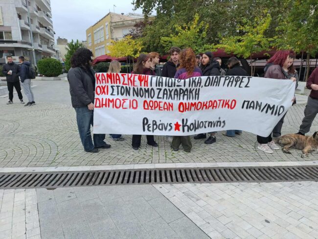 Διαμαρτυρία σημειώθηκε σήμερα 6 Νοεμβρίου 2025 στην πόλη της Κομοτηνής (αλλά και πανελλαδικά) από μαθητές της πόλης και φοιτητές του ΔΠΘ, με τη συμπαράσταση μάλιστα των καθηγητών τους, με βασικά θέματα τις κενές θέσεις εκπαιδευτικών, τα κτιριακά και λειτουργικά προβλήματα των σχολείων και των τμημάτων των Πανεπιστημίων, αλλά και τις αλλαγές που που εξήγγειλε η Σοφία Ζαχαράκη και αφορούν στο απολυτήριο λυκείου.