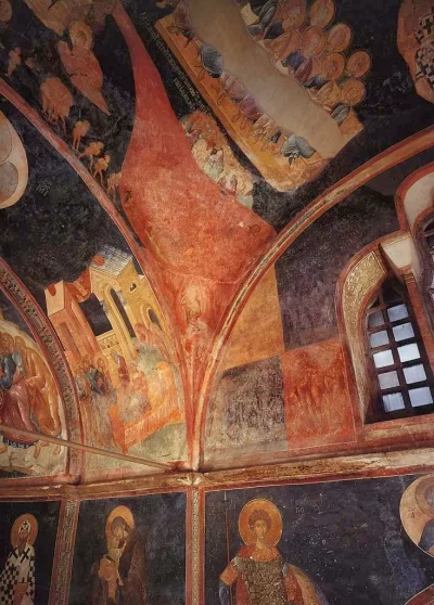 Οι εικόνες είναι από τις ωραιότερες Βυζαντινές. Τα χρώματα είναι έντονα, οι αναλογίες των μελών αρμονικές και η έκφραση των προσώπων φυσική. Ο μεσαίος τρούλος έχει μία ρωγμή που τον διασχίζει.
