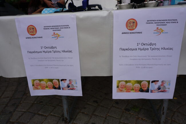 Τα στελέχη του προγράμματος «Βοήθεια στο Σπίτι» του Δήμου Κομοτηνής τίμησαν για μια ακόμη χρονιά την «Παγκόσμια Ημέρα Τρίτης Ηλικίας» που εορτάζεται κάθε χρόνο την 1η Οκτωβρίου και πραγματοποίησαν το πρωί της Τετάρτης μετρήσεις υγείας για όλους τους ενδιαφερόμενους δημότες, στην πλατεία Ειρήνης Κομοτηνής. Μέτρησαν τη γλυκόζη αίματος (σάκχαρο), την αρτηριακή πίεση και τον κορεσμό οξυγόνου σακχάρου και συζήτησαν με το κοινό τις όποιες απορίες τους μετά τη μέτρηση.