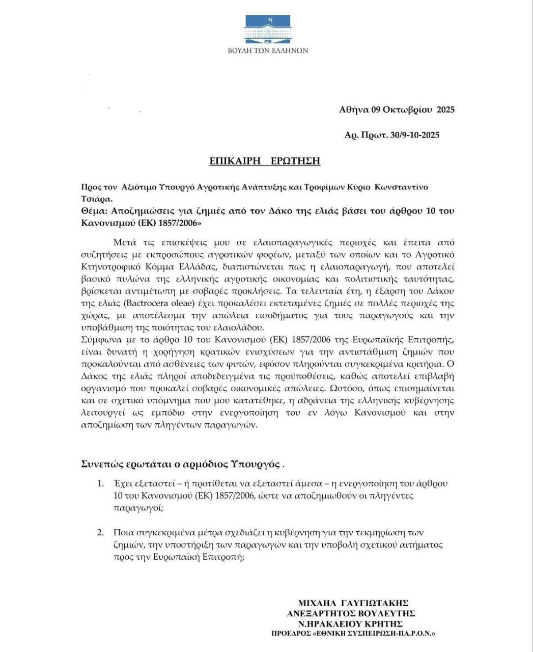 Η επίκαιρη ερώτηση του ανεξάρτητου βουλευτή Ηρακλείου Μιχάλη Γαυγιωτάκη για τις ζημιές από τον “δάκο της ελιάς” δεν ήταν τυχαία. Ήταν αποτέλεσμα τεκμηριωμένης πρότασης του Αγροτικού Κτηνοτροφικού Κόμματος Ελλάδας – ΑΚΚΕΛ, που συνεχίζει να υπερασπίζεται τους παραγωγούς όταν οι θεσμικοί φορείς σιωπούν. Η αναφορά στον Κανονισμό (ΕΚ) 1857/2006 και ειδικά στο άρθρο 10, φέρνει στο προσκήνιο ένα κρίσιμο ερώτημα: γιατί δεν ενεργοποιούνται τα ευρωπαϊκά εργαλεία αποζημίωσης;