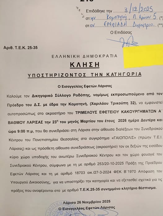 Κοινοποιήθηκε πριν από μερικές μέρες και στο Δικηγορικό Σύλλογο Ροδόπης κλήση, προκειμένου να παραστεί ενώπιον του Τριμελούς Εφετείου Κακουργημάτων Λάρισας στις 23 Μαρτίου 2026, όπου θα δικαστούν 36 συνολικά κατηγορούμενοι ως υπαίτιοι των αξιόποινων πράξεων που οδήγησαν στο τραγικό δυστύχημα των Τεμπών.