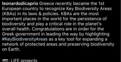 Στη συνέχεια, ο Λεονάρντο Ντι Κάπριο σημείωσε ότι «Αξίζουν συγχαρητήρια για την ελληνική κυβέρνηση να πρωτοστατήσει αναδεικνύοντας το #KeyBiodiversityAreas ως βασικό εργαλείο για την επέκταση ενός δικτύου προστατευόμενων περιοχών και τη διατήρηση της βιοποικιλότητας στη Γη».
