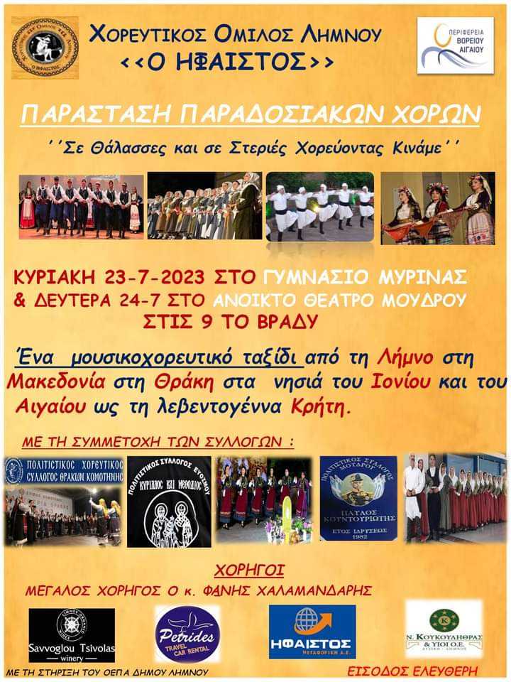 Ο Πολιτιστικός Χορευτικός Σύλλογος Θρακών Κομοτηνής θα ταξιδέψει από τις 21 έως τις 25 Ιουλίου 2023 στη Λήμνο, με αποστολή 54 χορευτών και μελών του. Θα συμμετέχει σε πολιτιστικές εκδηλώσεις που διοργανώνονται από τον τοπικό Χορευτικό Όμιλο Λήμνου ΄΄ Ο Ήφαιστος΄΄ , ο οποίος έχει συμμετάσχει για δύο συνεχόμενες χρονιές στις εκδηλώσεις των ΄΄Ελευθερίων΄΄ εκπροσωπώντας τη Λήμνο.