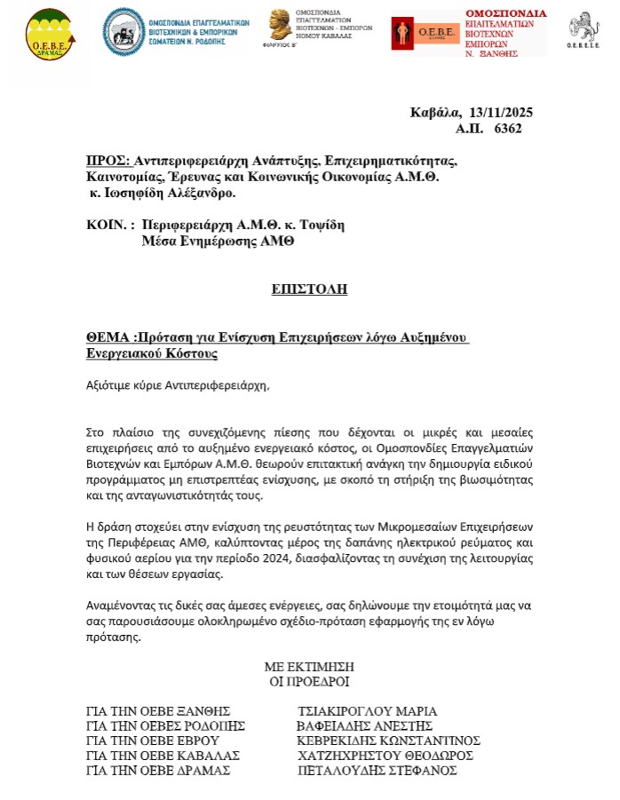 Την ανάγκη άμεσης ενίσχυσης των μικρών και μεσαίων επιχειρήσεων της Ανατολικής Μακεδονίας και Θράκης επισημαίνουν οι Ομοσπονδίες Επαγγελματιών, Βιοτεχνών και Εμπόρων της Περιφέρειας, με επιστολή τους προς τον Αντιπεριφερειάρχη Ανάπτυξης Αλέξανδρο Ιωσηφίδη.