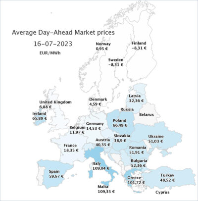 Ο μύθος λέει πως αν βάλουμε πολλά αιολικά+φωτοβολταϊκά θα έχουμε φθηνό ρεύμα. Στην πραγματικότητα ισχύει ακριβώς το αντίθετο! Όπως φαίνεται στο χάρτη, (που δημοσίευσε η Ρυθμιστική Ενέργειας), την Κυριακή 16/7 η Ελλάδα είχε τη 2η πιο τιμή ακριβή ρεύματος στην Ευρώπη, στη χονδρική αγορά. Τη Δευτέρα 17/7 την 3η πιο ακριβή, παρόλο που έχουμε ήδη σε λειτουργία πάνω από 10.000MW αιολικά+φωτοβολταϊκά. Μάλιστα η τιμή είναι διπλάσια ή υπερδιπλάσια απ’ τις γειτονικές χώρες. Η ακριβή τιμή χονδρικής σύντομα θα φθάσει στη λιανική, εξοντώνοντας νοικοκυριά και επιχειρήσεις: πώς θα ανταγωνιστεί π.χ. ο Ελληνικός τουρισμός την απέναντι ακτή του Αιγαίου;