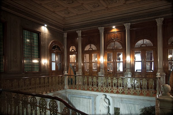 Το εσωτερικό σκοτεινό, γιατί το καφασωτό της πόρτας δεν αφήνει το φως να περάσει. Η πόρτα ανοίγει με βαρύ ήχο μετά το χτύπημα του κουδουνιού. Ο χώρος υποδοχής περίτεχνα διακοσμημένος. Νέα αναγεννησιακή πνοή διάχυτη στον χώρο, οι παραστάσεις των χρωμοτυπιών με θέματα από την μυθολογία. Τα χρώματα ξεθωριασμένα.