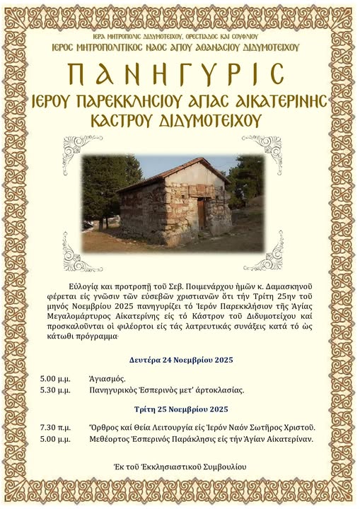 Την Τρίτη 25 Νοεμβρίου 2025 πανηγυρίζει το Ιερό Παρεκκλήσι της Αγίας Αικατερίνης στο Κάστρο Διδυμοτείχου. Όπως ενημερώνει η Ιερά Μητρόπολη Διδυμοτείχου, Ορεστιάδος και Σουφλίου, την παραμονή της μεγάλης εορτής, στις 24 Νοεμβρίου το απόγευμα, θα τελεστεί Αγιασμός και κατόπιν Πανηγυρικός Εσπερινός μετ’ αρτοκλασίας.